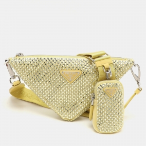 Prada Yellow Crystal Embellished Satin Triangle Logo Crossbody Bag