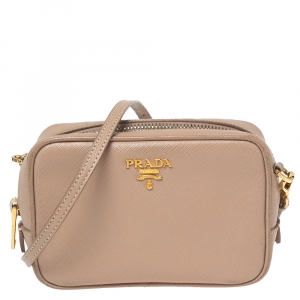 Prada Beige Saffiano Leather Mini Zip Top Camera Sling Bag