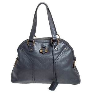 Yves Saint Laurent Blue/Black Leather and Canvas Large Muse Two Top Handle Bag