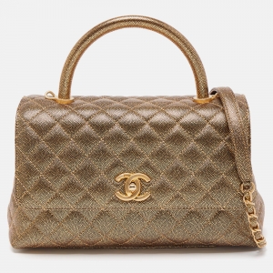 Chanel Silver Quilted Caviar Leather Small Coco Top Handle Bag