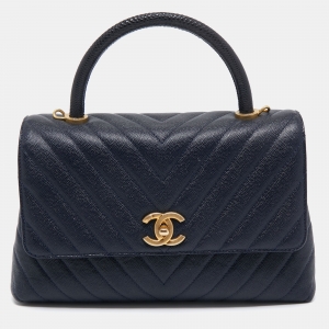 Chanel Dark Blue Chevron Caviar Leather and Lizard Medium Coco Top Handle Bag