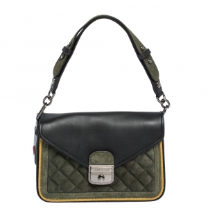Longchamp Black/Khaki Leather and Suede Le Pliage Heritage Top Handle Bag