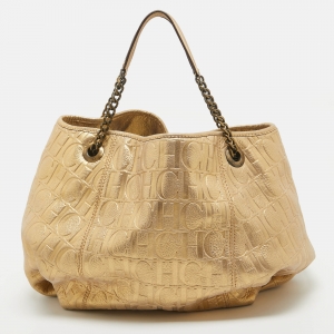 CH Carolina Herrera Gold Monogram Embossed Leather Chain Bow Hobo