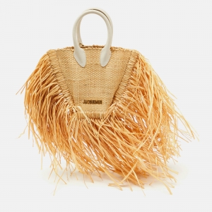 Jacquemus Beige Woven Raffia and Leather Le Baci Fringe Tote