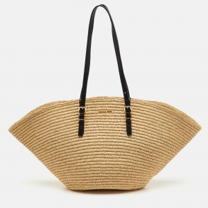 Michael Kors Beige/Black Raffia and Leather Fan Large Beach Tote