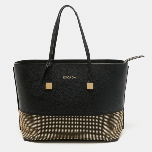 Escada Black Pebbled Leather Studded Zip Shopper Tote