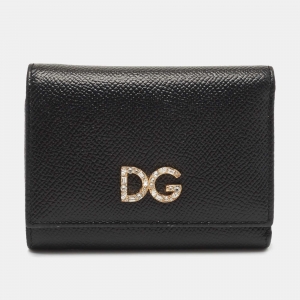 Dolce & Gabbana Black Leather DG Crystal Embellished Trifold Wallet