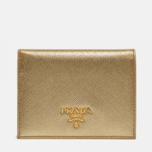 Prada Gold Saffiano Metal Leather Logo Bifold Wallet