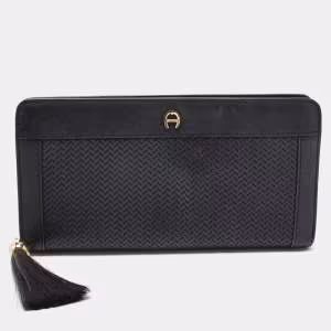 Aigner Black Woven Leather Cavallina Zip Around Continental Wallet