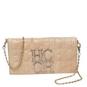 CH Carolina Herrera Beige Monogram Quilted Leather Crystal CH Wallet On Chain