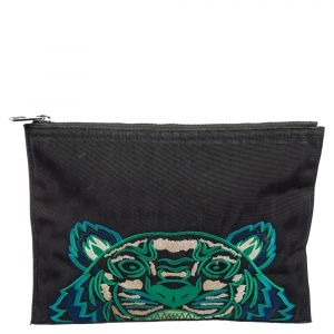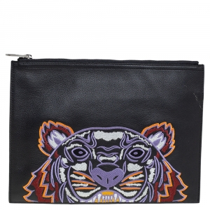 Kenzo Black Leather Tiger Embroidered Zipper Clutch