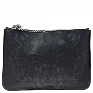 Kenzo Black Tiger Engraved Leather Wristlet Pouch