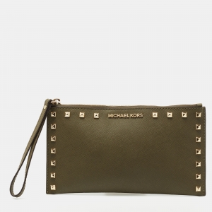 MICHAEL Michael Kors Olive Green Studded Leather Large Sandrine Zip Clutch