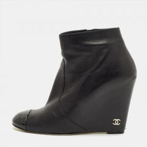 Chanel Black Leather CC Cap Toe Wedge Boots Size 39