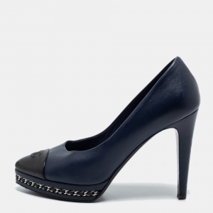 Chanel Navy Blue/Black Leather CC Cap Toe Chain Platform Pumps Size 38
