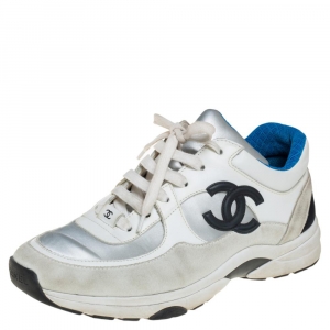 Chanel White/Silver Leather And Polyamide CC Low Top Sneakers Size 38