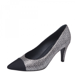 Chanel Metallic Silver/Black Textured Leather Cap Toe Scrunch Pumps Size 37