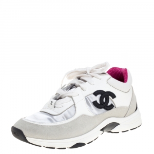Chanel Pink/White Satin, Mesh and Leather CC Sneakers Size 38.5