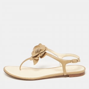 Chanel Metallic Gold Texture Leather CC Camellia Leaf Pearl Ankle Strap Thong Flat Sandals Size 38.5