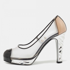 Chanel Black Fabric and Patent Leather Cap Toe CC Pumps Size 38