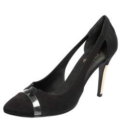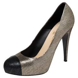 Chanel Silver Black/Silver Lurex Fabric And Leather CC Peep Toe Pumps Size 36