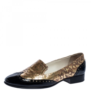 Chanel Metallic Gold And Black Patent Brogue Leather Slip On Oxford Size 39