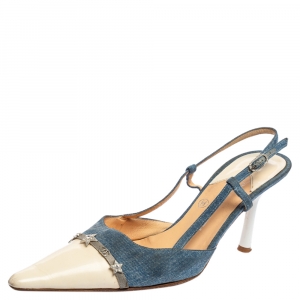 Chanel Blue/Cream Denim And Leather Crystal Embellished Pointed Toe Slingback Sandals Size 38