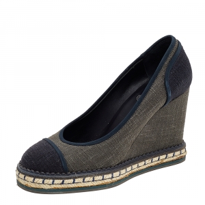 Chanel Grey/Dark Blue Canvas CC Cap Toe Wedge Pumps Size 38