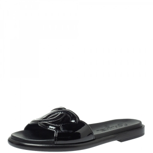 Chanel Black Patent Leather Strappy CC Heel Sandals Size 39