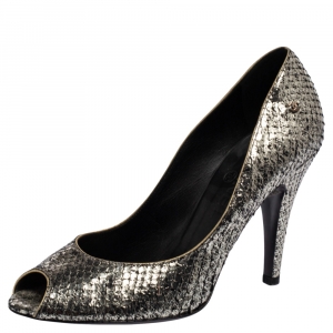 Chanel Gold Snakeskin Embossed Leather Embellished Bow Detail Ankle Strap Sandals Size 42