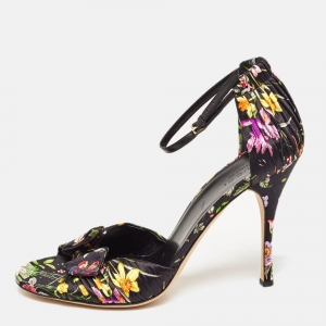 Gucci Black Floral Print Pleated Satin Bow Ankle Strap Sandals Size 39