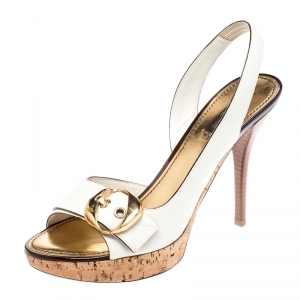 Louis Vuitton White Leather Buckle Cork Platform Slingback Sandals Size 40