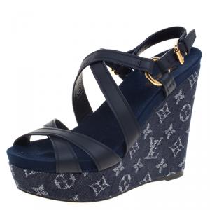 Louis Vuitton Navy Blue Monogram Canvas Espadrille Wedge Sandals Size 38