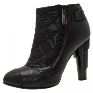 Chanel Black Leather and Fabric Cap Pointed-Toe Ankle Booties Size 36.5