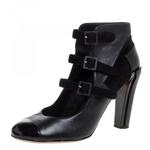 Chanel Black Leather and Fabric CC Cap Toe Embellished Ankle Boots Size 36