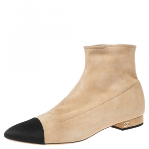 Chanel Beige & Black Mid Calf Boots Size 37.5