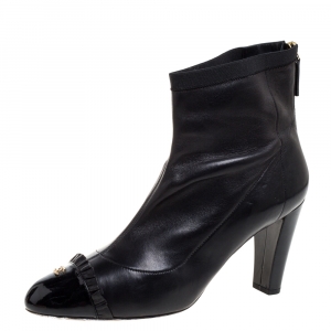 Chanel Black Leather and Fabric Cap Pointed-Toe Ankle Booties Size 36.5