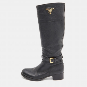 Prada Black Leather Knee Length Block Heel Boots Size 37