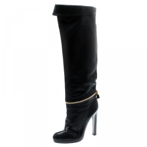 Sergio Rossi Black Leather Faux Zipper Detail Knee Length Boots Size 36