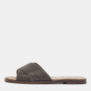 Brunello Cucinelli Brown Textured Leather Monili Trim Flat Slides Size 38