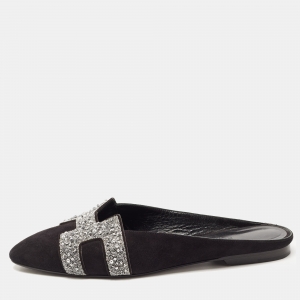 Hermes Black Suede Crystal Embellished Trim Oran Flat Slides Size 38