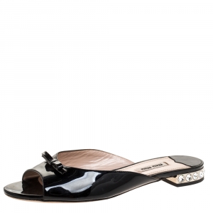 Miu Miu Black Patent Leather Bow Embellished Flat Slides Size 36