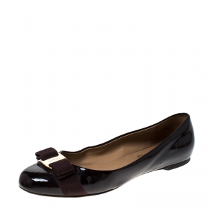 Salvatore Ferragamo Black Lazer Cut Patent Leather Vara Bow Flats Size 40