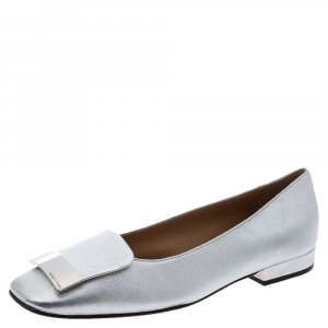 Sergio Rossi Silver Leather sr1 Metal Plate Detail Square Toe Ballet Flats Size 40