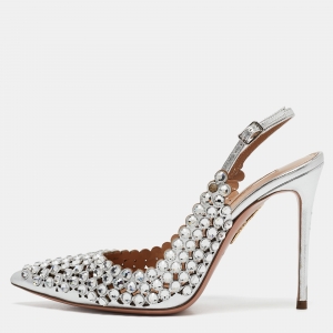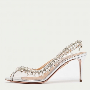 Aquazzura Silver PVC And Leather Temptation Crystal Sandals Size 38
