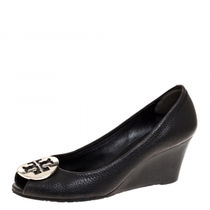 Tory Burch Black Leather Wedge Peep Toe Pumps Size 38