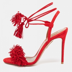 Aquazzura Red Suede Fringe Flat Slides Size 41