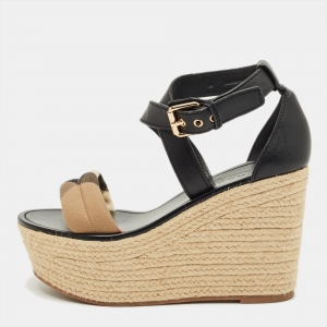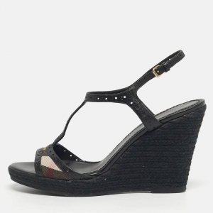 Burberry Beige/Black House Check Canvas and Patent Wedge Sandals Size 41