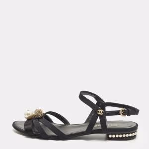 Chanel Black Satin Pearl Embellished Ankle Wrap Sandals Size 39.5