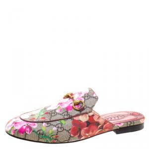 Gucci Begie Blooms Print GG Supreme Canvas Princetown Hosrebit Flat Mules Size 37